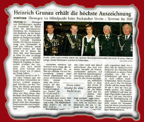 Beckstedt im Mittelpunkt. Die höchste Auszeichnung, eine Ehrennadel in Gold plus Urkunde, erhielt Heinrich Grunau, der dem Verein seit 40 Jahren die Treue hält.