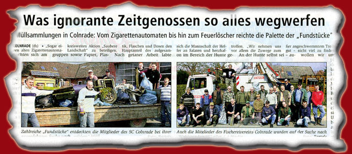 Fischereivereins Colnrade versammelten sich am 31. März unter dem Motto der kreisweiten Aktion "Saubere Landschaft" zum gemeinsamen Müllsammeln. Von Papier, Plastik, Flaschen bis hin zu Fahrradrahmen, Autoreifen und einem Zigarettenautomaten wurden zusammengetragen.