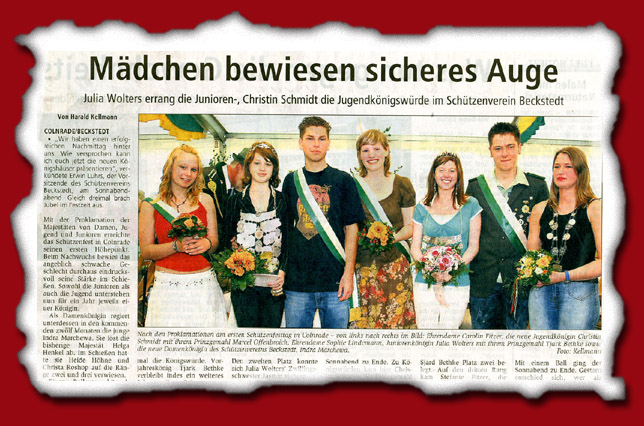 Schützenverein Beckstedt jedes Jahr organisiert wird. Etwa 100 Mädchen und Jungen, die sich als Banditen, Polizisten, Feen, Prinzessinnen, Piraten oder Cowboys verkleidet hatten, folgten dem Kinderschützenkönig Philip I und seiner Prinzessin Sophie in den geschmückten Saal des Dorfgemeinschaftshauses. Als die Kinder schließlich müde vom vielen Spielen und Tanzen ins Bett fielen, ließen die junggebliebenen Karnevalisten den Tag noch bei einer kleinen Tasse Bier ausklingen.
