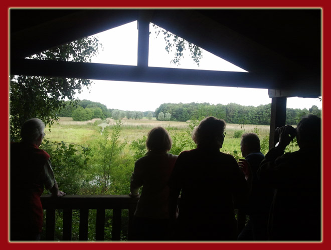 Bereits zu Beginn des Frühstücks in der Grillhütte auf dem Eglingsplatz in Beckstedt begann der leichte "Landregen". Doch gut gestärkt machten sich dann 32 Erwachsene und sieben Kinder in Fahrgemeinschaften mit PKW auf den Weg nach Ostrittrum. Auf der Fahrt wurde der Regen stärker, doch vor Dötlingen war es plötzlich trocken und so waren alle frohen Mutes, als der Parkplatz bei der Osterittrumer Wasssermühle erreicht war. Hier warteten Rainer Struß vom Ostrittrummer Mühlerverein und Ortsvorsteher Alex Hollmann auf die Wandergruppe mit Gerold Schäfer an der Spitze. Sie führten die Frühwanderer auf dem gut zweistündigem Rundgang durch Ostrittrum und seiner herrlischen Landschaft entlang dem Huntetal. Hier erfuhren sie dann viel über den Ort und seine Hofstellen, von der privaten Grabstätte am Rande der Abbruchkante zwischen Geest und Huntetal und den früheren Rieselwiesen entlang der Hunte. In einem Schaukasten konnte einem Bienenvolk zugeschaut werden, während der Imker fachliche Informationen gab. Einen Wermutstropfen gab es leider, denn der Regen erreichte dann doch die Wandergruppe und Regenschirme bestimmten das Bild und forderte kräftige Arme, um nicht allzu nass zu werden. Doch dies tat der Stimmungen keinen Abbruch und mit neuen Eindrücken kehrten die Heimatbundfreunde nach einer kleinen Pause bei der Wassermühle in ihre Gemeinde zurück.