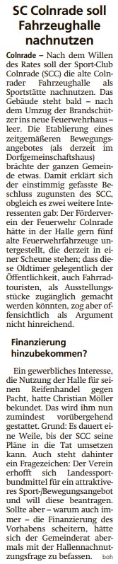 Rat beschließt N achnutzung der alten Fahrzeughalle durch den SC Colnrade