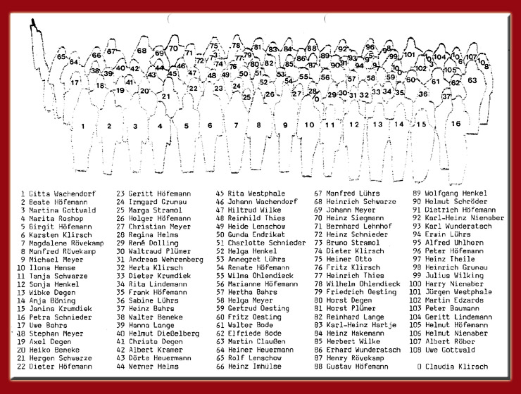 3. Reihe von oben: Dietrich Rövekamp, Hermann Krumdieck, Heinrich Loppe, Heinrich Siemer, Johann Runge, Heinrich Maschmann, Willi Poppe, Heinrich Oestermann, Dietrich Kolweyh, Dietrich Plümer, Heinrich Thies, Heinrich Rohlfs, Bernhard Meyer, Heinrich Gellermann, Heinrich Plümer, Friedrich Brand, Karl Nienaber