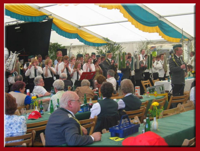 Aus diesem besonderen Anlass fand am Vormittag ein festlicher Gottesdienst zusammen mit der Bevölkerung und den bereits am Vortag angereisten "Eglinger Edelweißschützen" statt. Die Freunde aus Egling hatten ihre vielköpfige Blaskapelle mitgebracht und gaben der morgendlichen Feierstunde einen glanzvollen Rahmen. Pastor Ehrenreich, der das Jubiläum wunderschön in den Gottesdienst einbezogen hatte, war der Anfrage des Vorsitzenden gerne gefolgt und hatte den sonntäglichen Kirchgang ins Festzelt verlegt. Es war eine unvergessene, würdige Feierstunde. Anschließend gab es Gulaschsuppe für alle.
