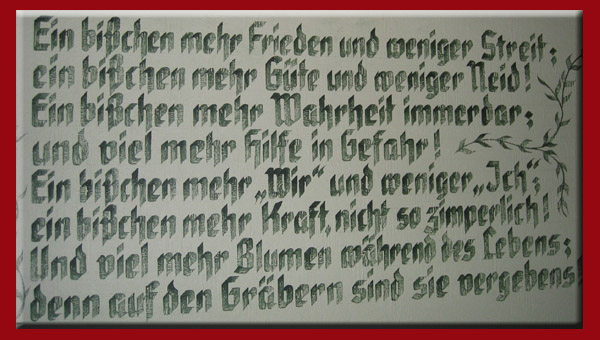 "Die Kunst am Bau" durfte auch nicht fehlen. So wurde in freihändiger Manier von Walter Bode, dem seinerzeitigen Adjutanten des Vereins, der schöne Wandspruch gestaltet, wonach es sich heute immer noch lohnt, zu leben.