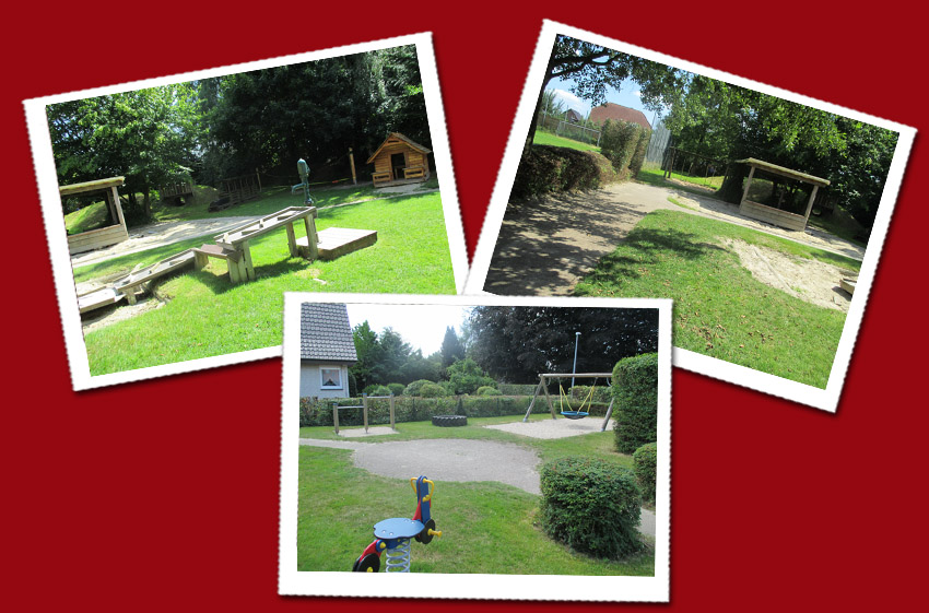 Ein großzügiges Außengelände mit vielen Bewegungsmöglichkeiten wie z. B. Holzklettereisenbahn, Vogelnestschaukel, Waldhügel usw. laden zum Spielen und Wohlfühlen ein.