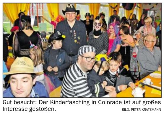 Jedes Jahr am Samstag vor Rosenmontag marschieren etwa 100 Mädchen und Jungen in unterschiedlichen Verkleidungen ins Colnrader Dorfgemeinschaftshaus. Organisiert wird die Maskerade vom Sportverein Colnrade.