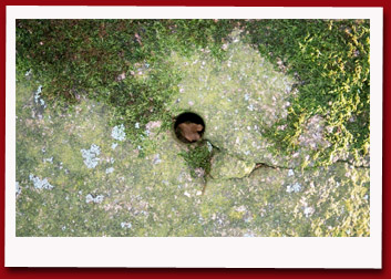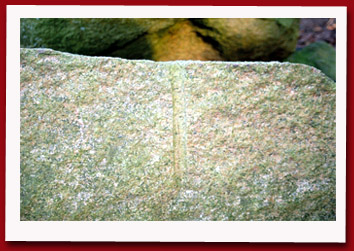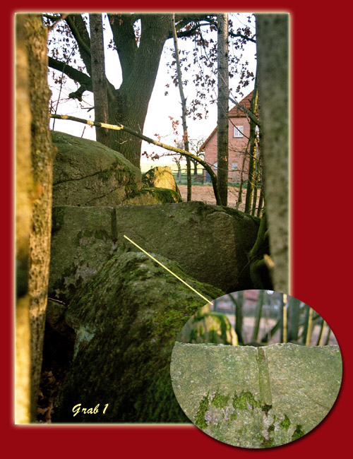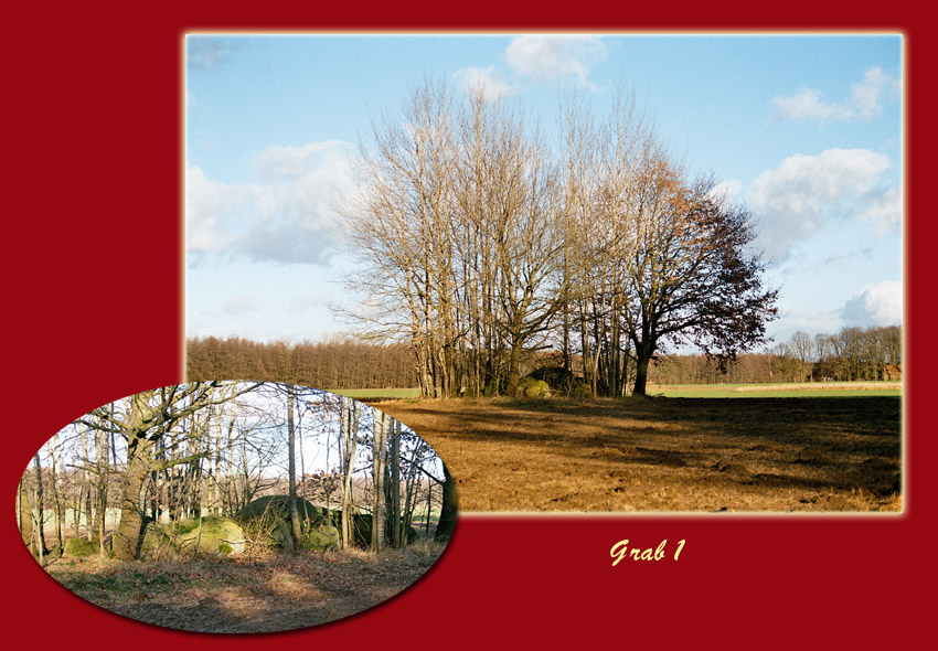 Das erste Grab ist das kleinere. Es liegt versteckt in einem kleinen Gebüsch in einer Wiese in Sichtweite von Grab 2. Wenn man das Gebüsch von der Straße aus sieht, vermutet man kaum, welch große Decksteine darin verborgen sind. Die 14 x 2 m lange Grabkammer ist zum größten Teil unversehrt erhalten, d.h. 18 - 19 Tragsteine und 7 Decksteine liegen noch mehr oder weniger in ihrer ursprünglichen Lage.