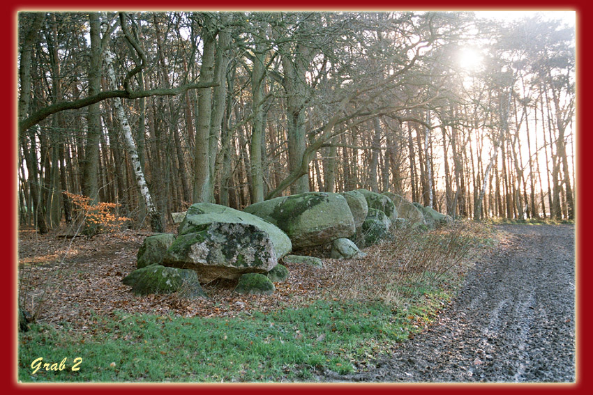 Grab 2 ist das imposantere von beiden. Es liegt direkt am Waldesrand, und ist im Sommer von Gebüsch verborgen. Wie bei einigen anderen Großsteingräbern ist auch hier die Anlage nur im Winter ungestört zu bewundern.