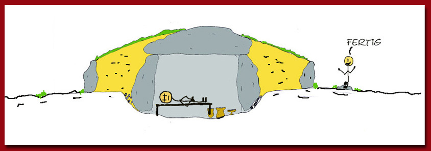 Die Menschen der „Trichterbecherkultur”, eine vollbäuerliche Kultur – so benannt nach einer charakteristischen Gefäßform - konstruierten aus den Megalithen die Grabmähler. Die Toten wurden demnach zwischen die großen Megalithen (unbehauene Steinkolosse) gelegt und die Zwischenräume mit kleineren Steinen ausgefüllt. Zum Schluß wurde alles mit Erde überdeckt. Hierzu benötigte man keine Riesen und auch nicht mehrere Jahre, sondern in erstaunlich kurzer Zeit und mit überraschend einfachen Mitteln wurden Großsteingräber konstruiert: Die Megalithen hatten eiszeitliche Gletscher lange zuvor in die Geest befördert. Man transportierte sie mit Hilfe von Ochsengespannen über rollende Baumstämme zu der Stelle, wo das Grab vorgesehenen war. Man ließ die als Trägersteine vorgesehenen Megalithen aufrecht in den zuvor ausgehobenen Boden ein und hievte die tonnenschweren Decksteine über Rampen auf das Grab. Damit der Boden nicht nachgab, wartete man, bis er gefroren war.